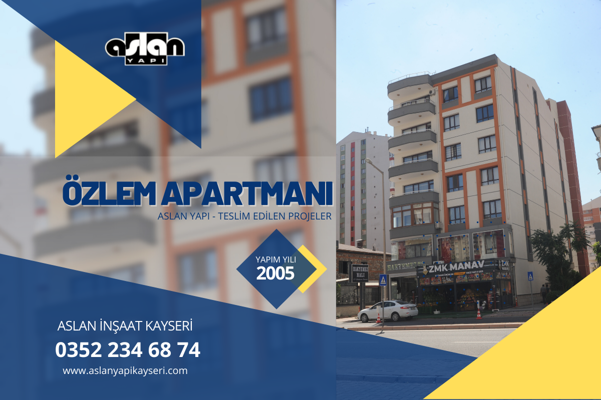 ÖZLEM APARTMANI 2005 Yılında tamamlanmıştır. Kalite , Güven ve Tecrübe sloganı ile Kayseri’de projelerine devam etmektedir.
