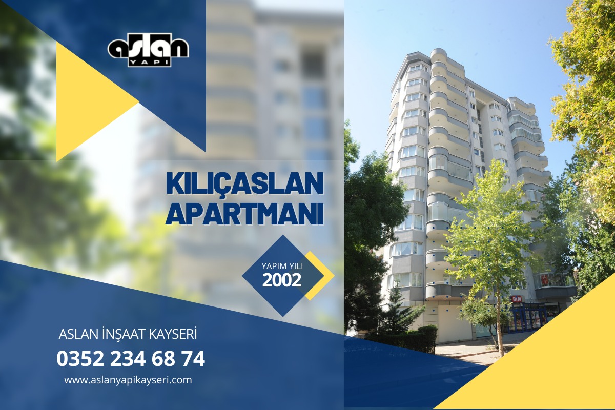 KILIÇASLAN APARTMANI 2002 Yılında tamamlanmıştır. Kalite , Güven ve Tecrübe sloganı ile Kayseri’de projelerine devam etmektedir.