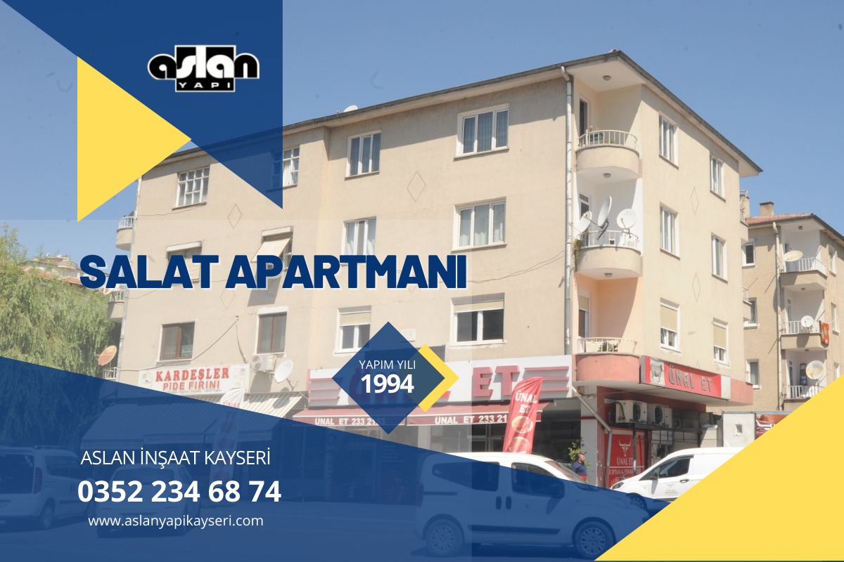 SALAT APARTMANI 1994 Yılında tamamlanmıştır. Kalite , Güven ve Tecrübe sloganı ile Kayseri’de projelerine devam etmektedir.